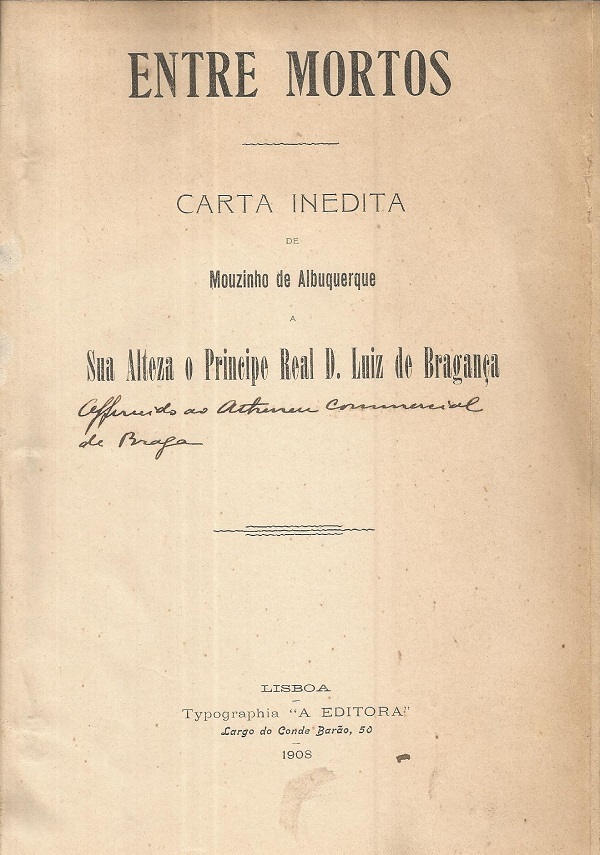 Carta inédita de Mouzinho de Albuquerque a Sua Alteza o Príncipe Real D.Luis de BragançaTyp. A Editora, Lisboa, 1908, encadernação coeva, sem capas de brochura, 14/14 pgs.Com “Reproducção photographica reduzida do autographo”.