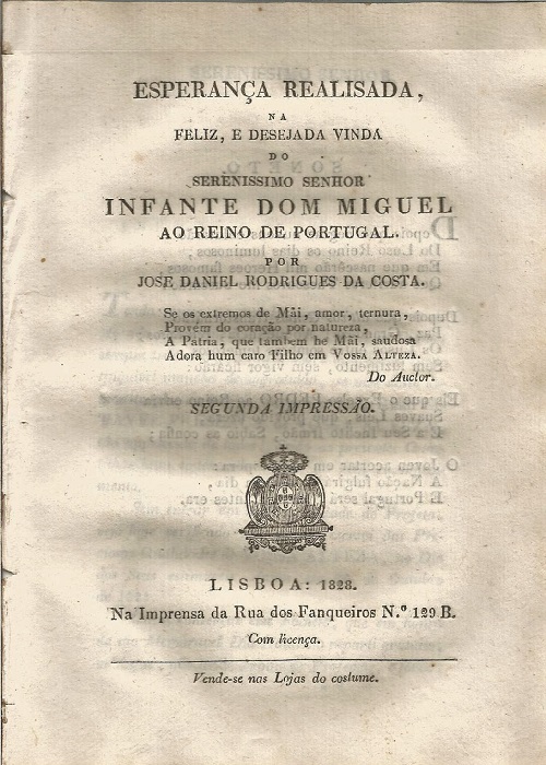 Esperança realisada,/na/ feliz, e desejada vinda/ do/ Sereníssimo Senhor/ Infante D.Miguel/ ao Reino de Portugal.