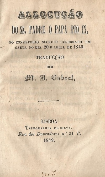 Allocução de SS.Padre o Papa Pio IX, no consistório secreto celebrado em Gaeta no dia 20 de Abril de 1849