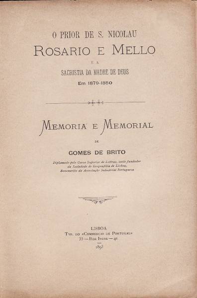 O Prior de S.Nicolau, Rosário e Mello e a sacristia da Madre de Deus em 1879-80Lisboa 1893, capas cartonadas, VIII/33 pgs.