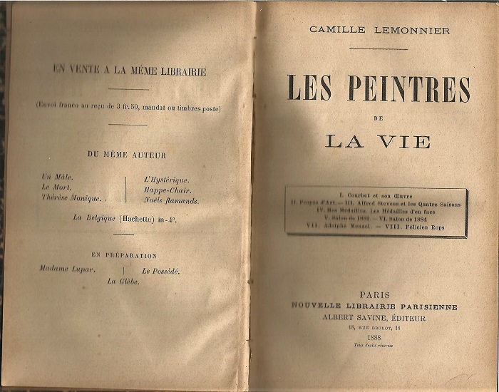 I – Courbet et son oeuvre. II – Propos d’art. III – Alfred Stevens et les quatre saisons. IV – Mês Médailles. Les Médailles d’en face. V – Salon de 1882. VI – Salon de 1884. VII – Adolphe Meuzel. VIII – Felicien Rops.