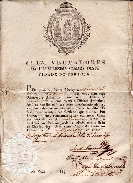 Curioso documento habilitando Manoel da Silva(natural da freguesia da Lavra, lugar do Coiço) a exercer o ofício de carpinteiro. Consta da carta de despacho impressa e com o selo branco da Cidade do Porto e, bem assim, das demais peças processuais instrutórias(requerimentos, certidões) que são manuscritas.