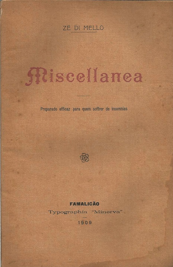 Preparado efficaz para quem soffrer de insomniasTyp. Minerva, Famalicão, 1909, brochado, com dedicatória do Autor “ao ilustre caudilho da democracia portugueza, Ex.mo Senhor Doutor, António José d’Almeida”, 83 pgs.