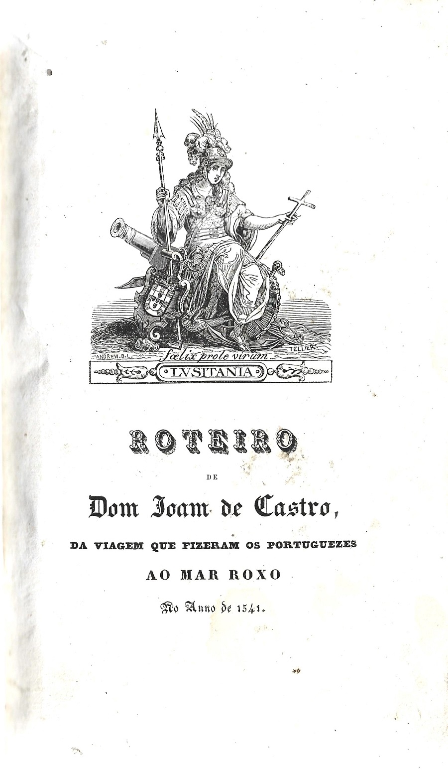 POR/ D.JOAM DE CASTRO/ DECIMO TERCEIRO GOVERNADOR, E QUARTO VISO-REY DA INDIA/ dedicado/Ao Infante D.Luiz./ tirado a luz pela primeira vez do manuscrito original,/e acrescentado com o itinerarium Maris Rubri/ e o retrato do Author, etc, etc, etc/ Pelo Doutor Antonio Nunes de Carvalho,/ da Cidade de Vizeu,/ Professor de Philosophia Rac. e de Moral, e de Jurisprudencia Civil/ naUniversidade de Coimbra./ Ŕ custa de huma sociedade de Portuguezes.