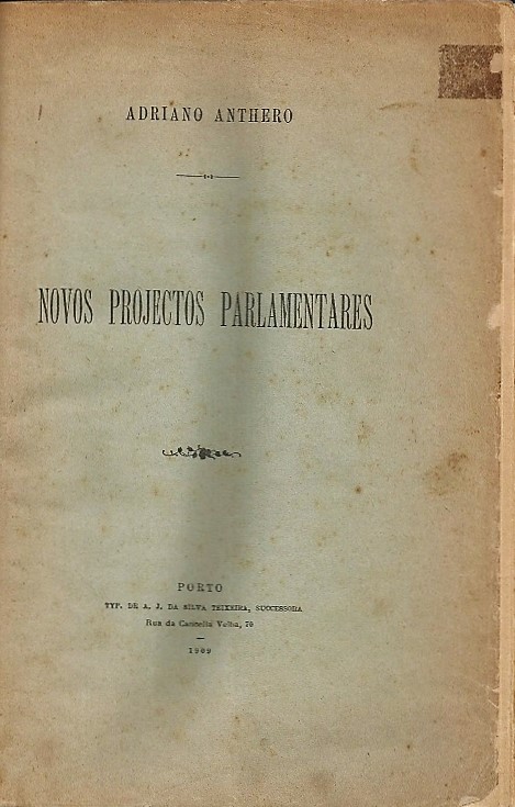 Typ. de A.J.da Silva Teixeira Sucessora, Porto, 1909, encadernação recente mantendo as capas de brochura, com dedicatória do Autor, 42 pgs.Exemplar cujas capas apresentam falhas (mormente a posterior).