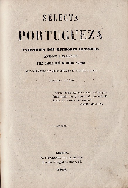 Selecta Portugueza extrahida dos melhores clássicos antigos e modernos (...) aprovada pelo Conselho Geral de Instrucção Pública