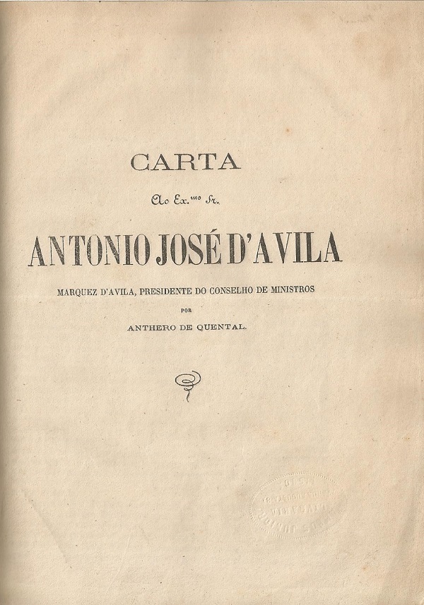 Carta ao Ex.mo Sr.António José d’Ávila. Marquez d´Ávila, Presidente do Conselho de Ministros