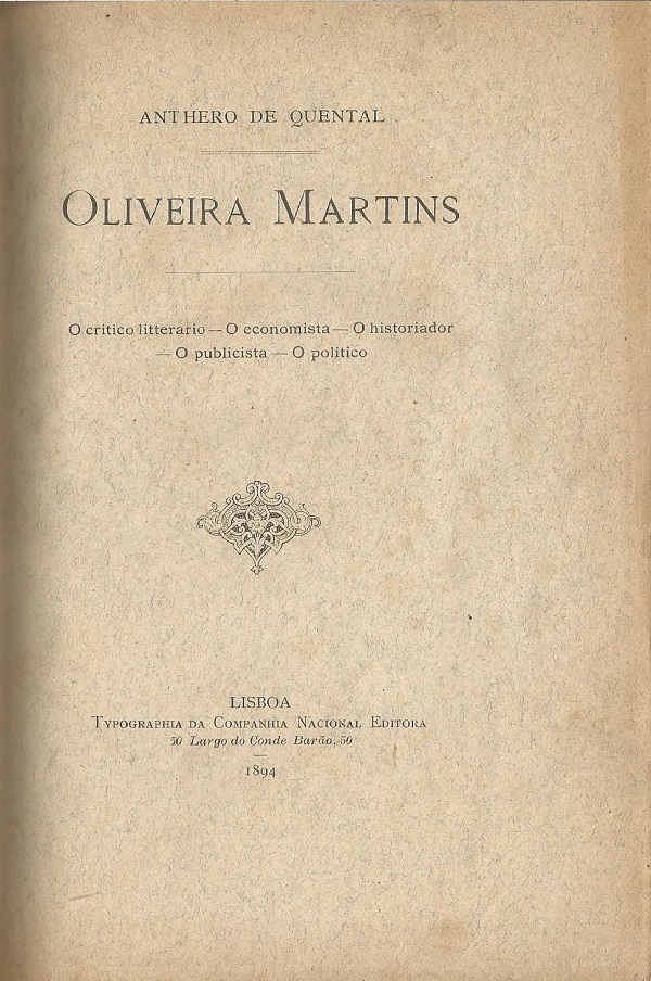 O critico litterario – O economista – O historiador – O publicista – O político.Typ. da Companhia Nacional Ed., Lisboa, 1894, boa encadernação recente em material sintético, com capas de brochura, 52/4 pgs.