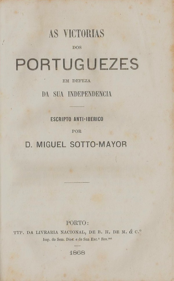 Escripto anti-ibéricoTyp. da Liv. Nacional, Porto, 1868, encadernação coeva sem capas de brochura, 135 pgs.Exemplar com alguma acidez disseminada.Raro