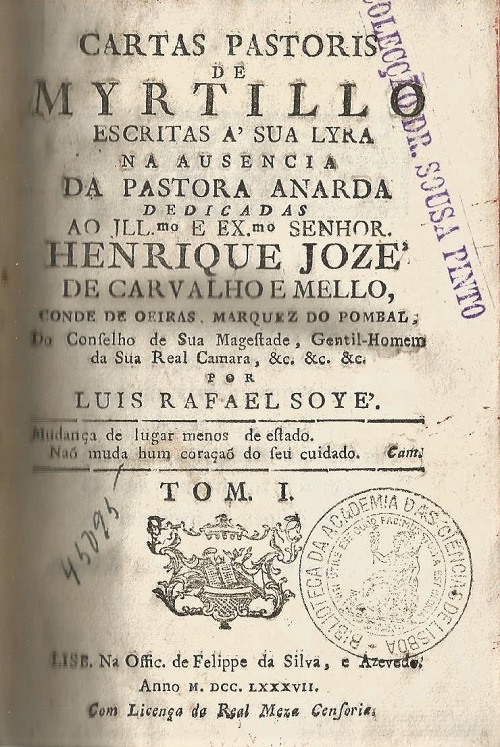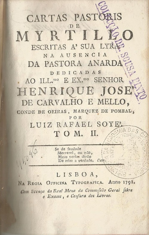 Cartas pastoris/de/ Myrtillo/ escritas à sua lyra/ na ausencia/ da Pastora Anarda/ dedicadas/ Ao Ill.mo e Ex.mo Senhor,/Henrique Jozé/ de Carvalho e Mello,/ Conde de Oeiras. Marquez do Pombal,/ do Conselho de Sai Magestade/ Gentil-Homem/ da sua Real Camara, etc, etc, etc.