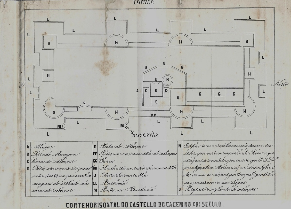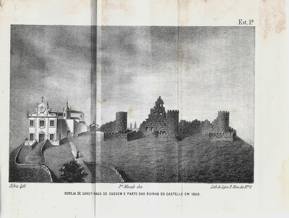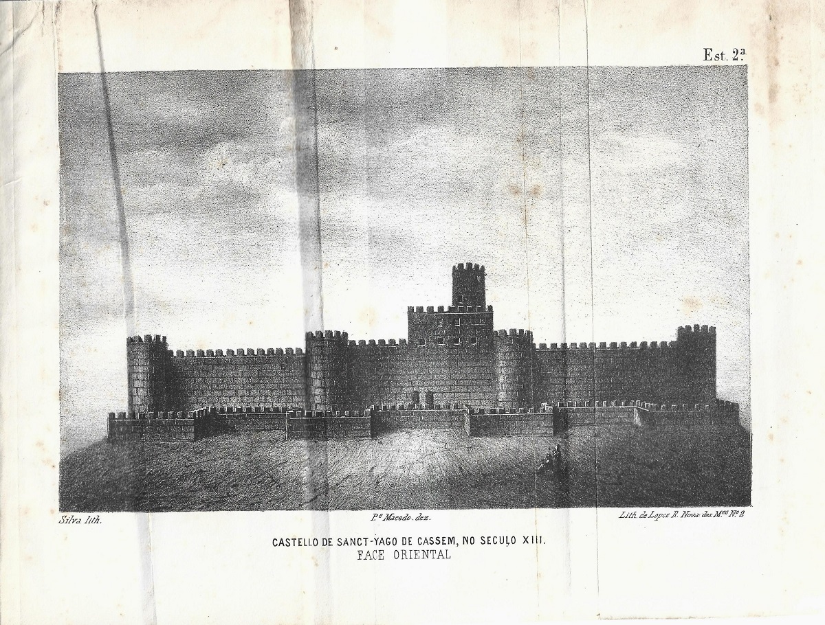 Typ. de Sousa Porto & Vaz, Beja, 1866, encadernação coeva, com a capa anterior de brochura, com 3 estampas desdobráveis (Egreja de Sanct-Yago de Cassem e parte das ruinas do Castello em 1850; Castello de Sact-Yago de Cassem no seculo XIII, face oriental; Corte horisontal do Castello do Cassem no XIII seculo), VII/205 pgs.