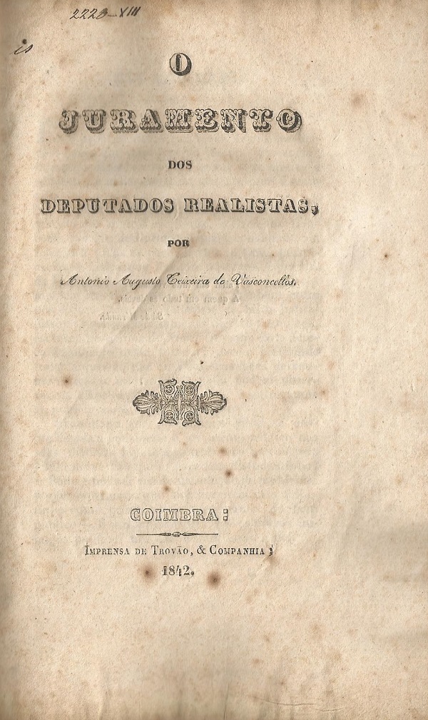 Imprensa de Trovão, & Companhia, Coimbra, 1842, encadernação recente, 16 pgs.Exemplar com leve acidez disseminada. Muito raro.