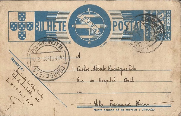Bilhete-postal manuscrito, dirigido a Carlos Pato, datado “Ericeira, 23 de Setembro de 1938, em tarde chuvosa”.
