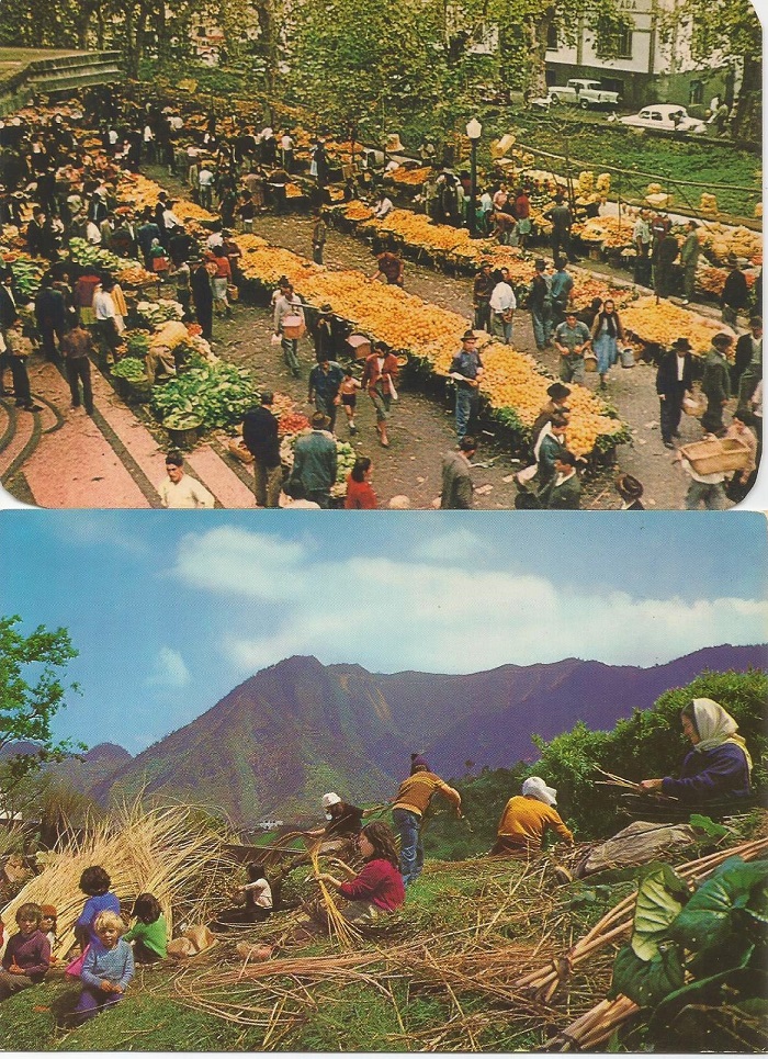 Conjunto de 3 postais ilustrados: Funchal, o mercado; Camacha, preparação de vimes; Porto da Cruz, cena rural.